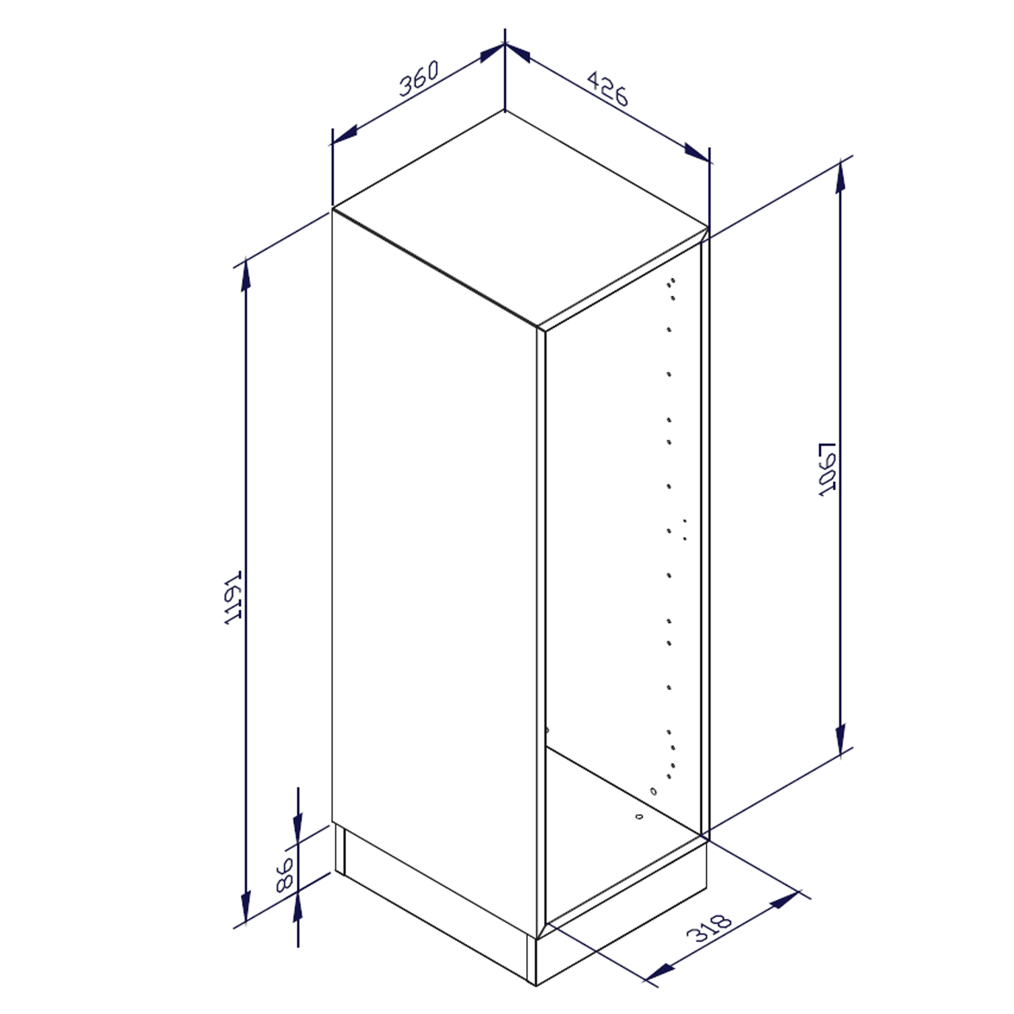 Die Sockelhöhe beträgt 8,6 cm. Beim Einsatz von optional erhältlichen Rollen verändert sich die Sockelhöhe nicht. Die Materialstärke der Wände und der Fachböden beträgt 19 mm, die feste Rückwand ist 8 mm stark und garantiert eine hohe Stabilität.