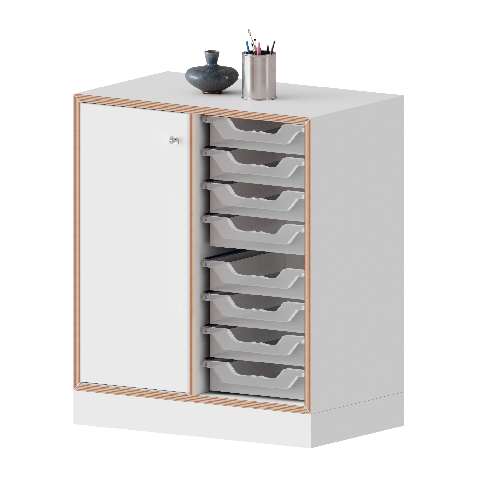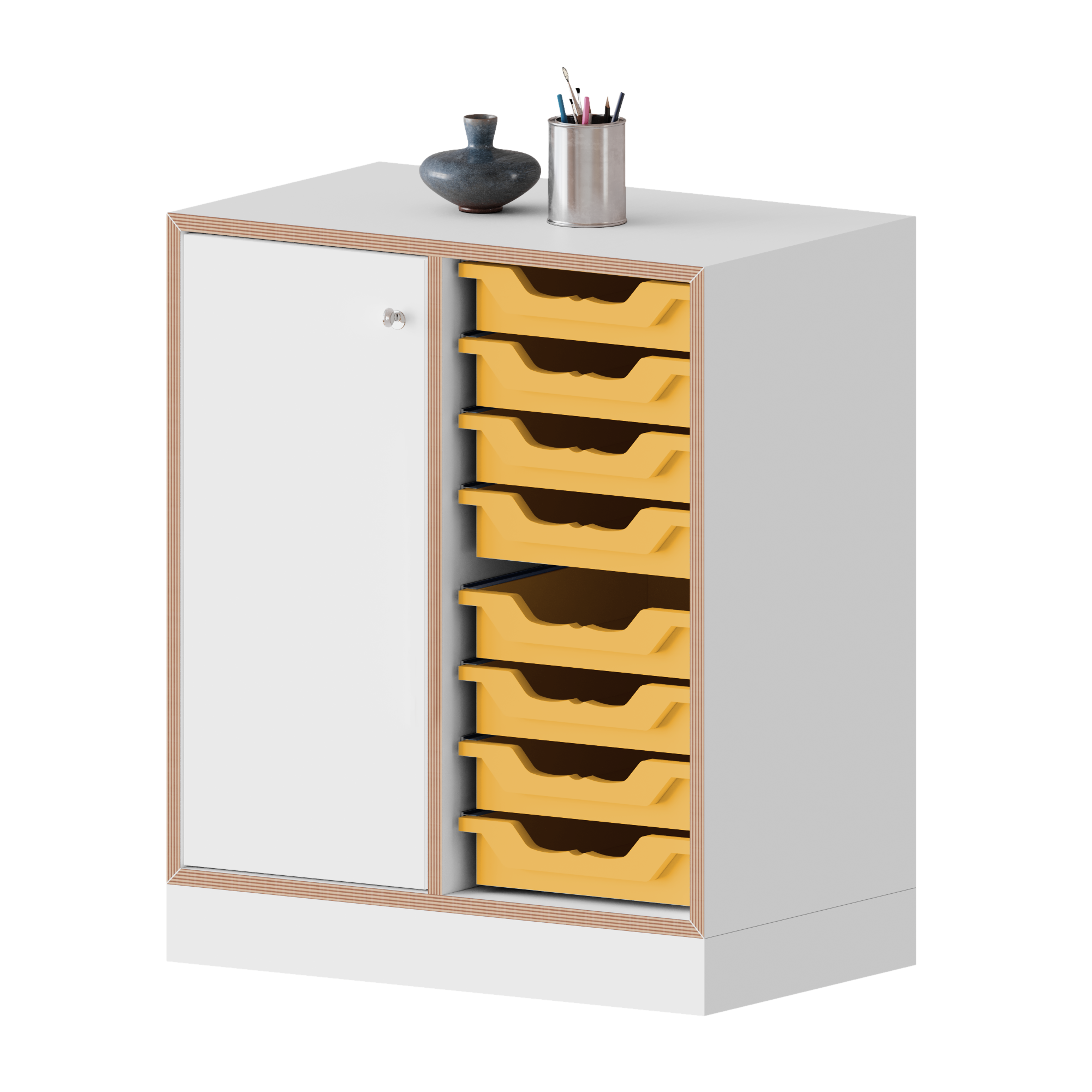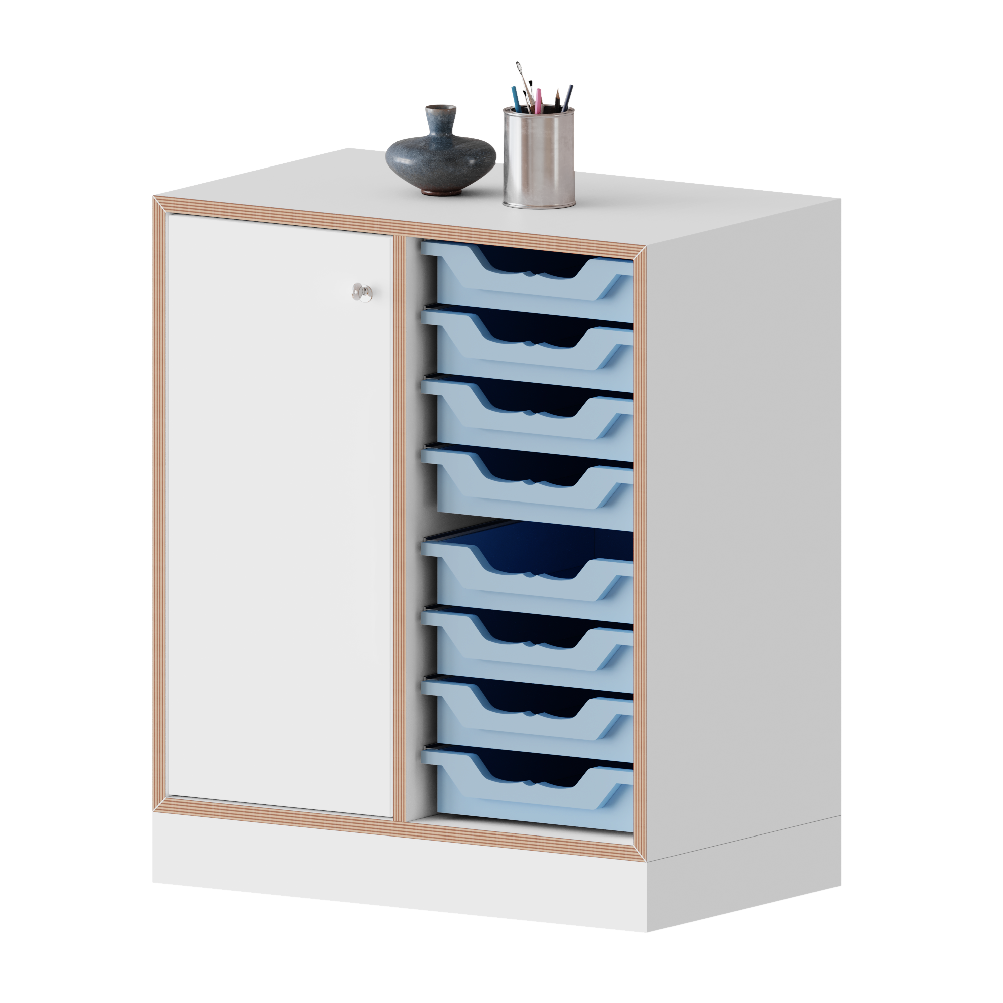 Der Schrank glänzt durch viel Stauraum und Mobilität, wodurch er sowohl in Schulen als auch in Büros seinen Platz findet. Er beinhaltet 8 kleine Ergo Tray Boxen in denen all deine Unterlagen organisiert ihren Platz finden. Außerdem ist das Schranksystem jederzeit erweiterbar und kann auf Wunsch auch mit einem Satz Rollen, davon zwei feststellbar, bestellt werden.