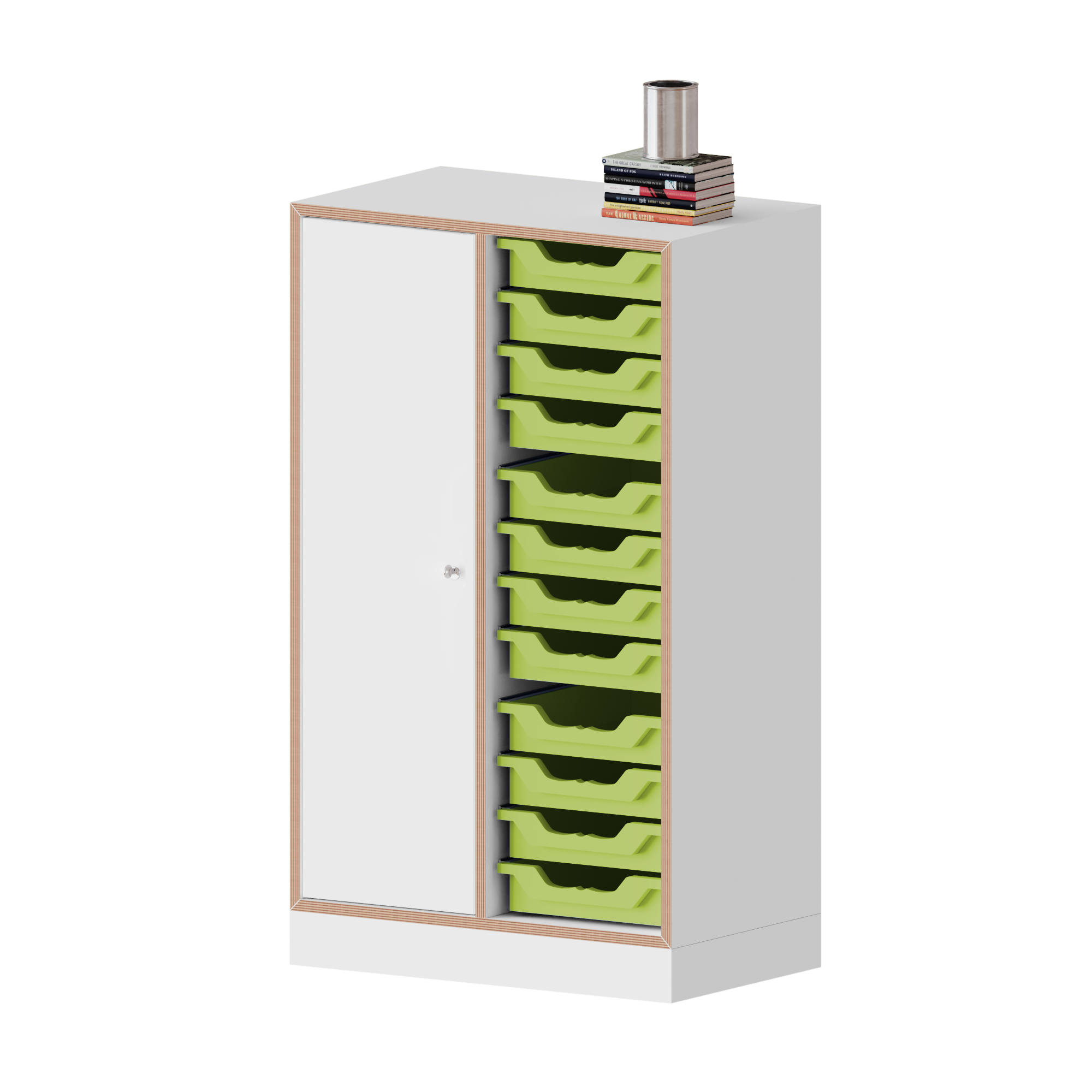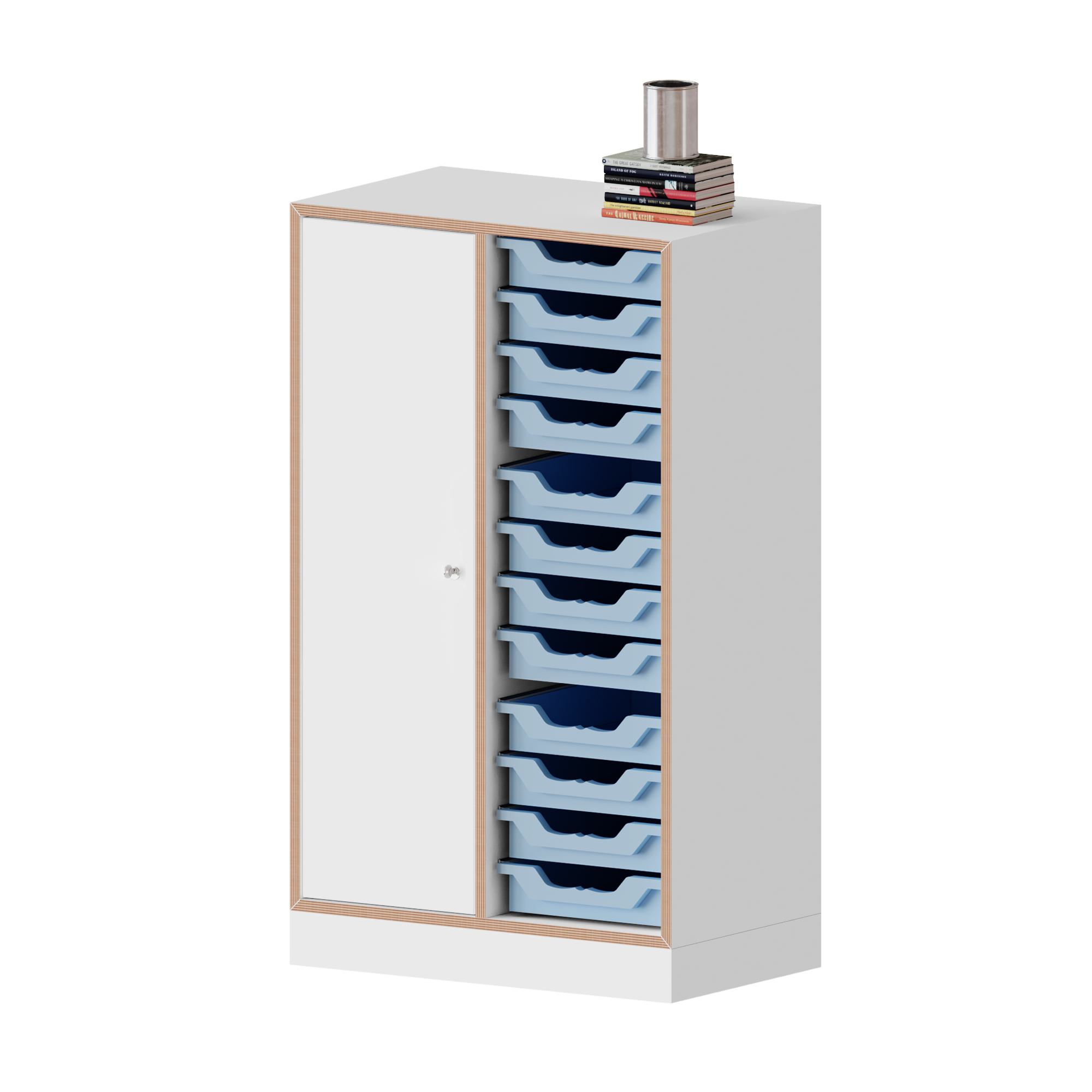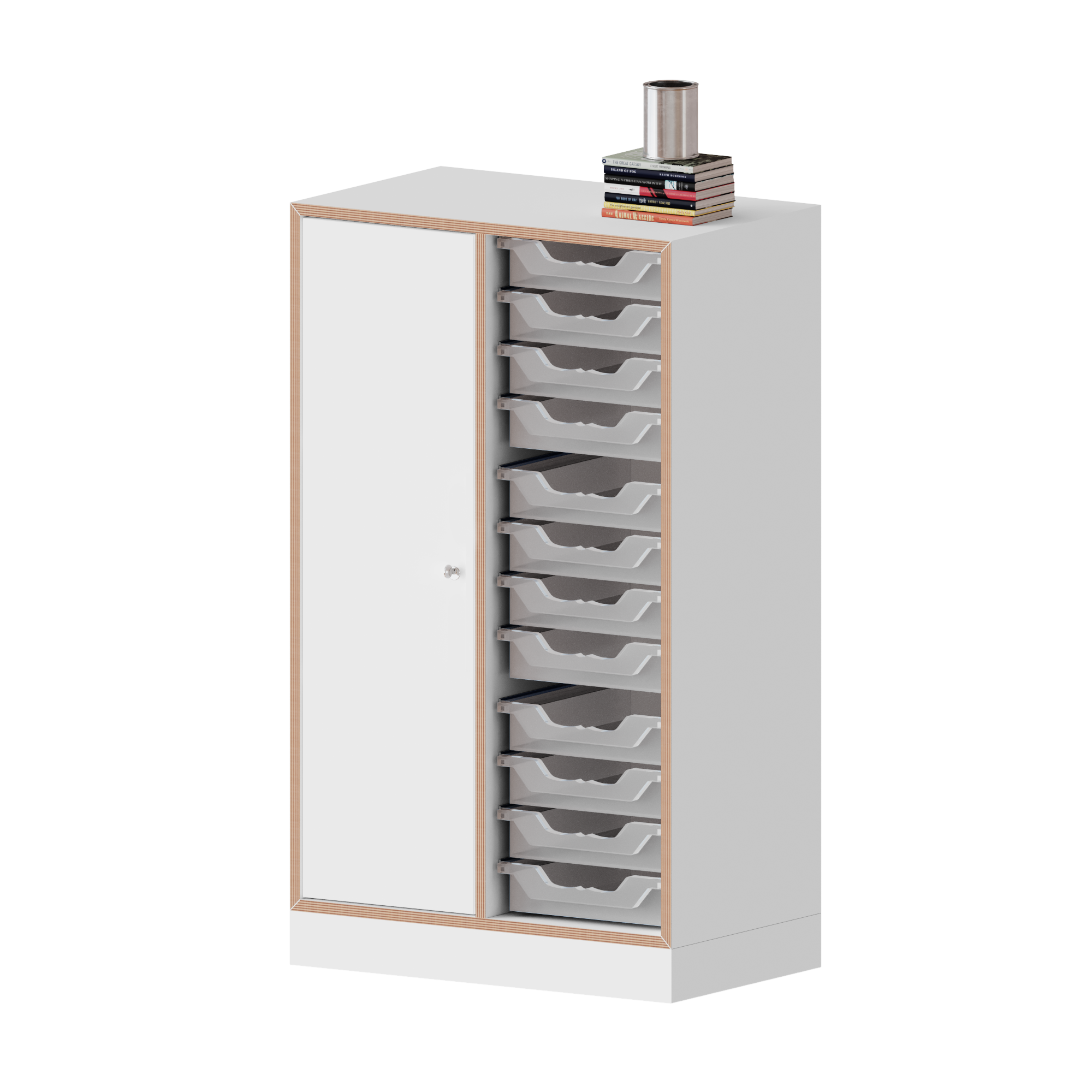 Der Schrank glänzt durch viel Stauraum und Mobilität, wodurch er sowohl in Schulen als auch in Büros seinen Platz findet. Er beinhaltet 12 Kleine Ergo Tray Boxen in denen all deine Unterlagen organisiert ihren Platz finden. Außerdem ist das Schranksystem jederzeit problemlos erweiterbar und kann auf Wunsch auch mit einem Satz Rollen, davon zwei feststellbar, bestellt werden.