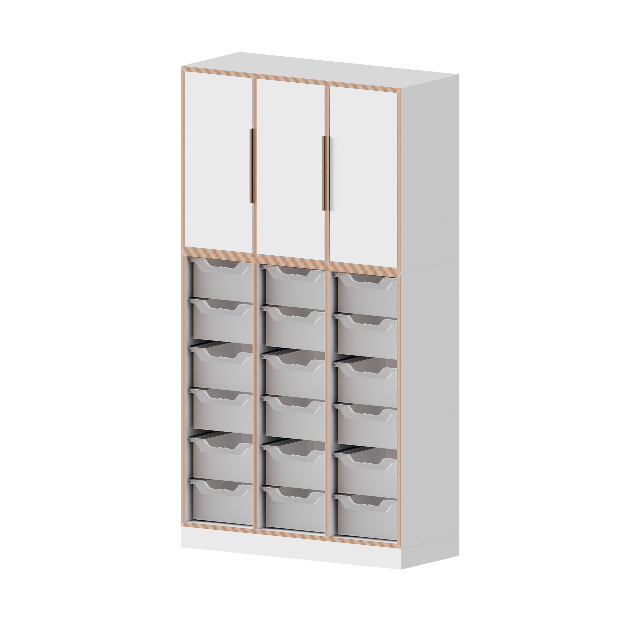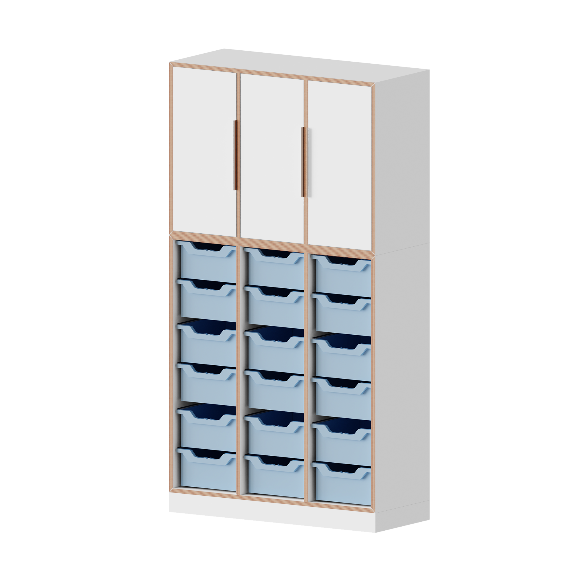 Der Schrank glänzt durch viel Stauraum und Mobilität, wodurch er sowohl in Schulen als auch in Büros seinen Platz findet. Er besteht aus einem Schrank mit 3 Ordnerhöhen und einem zusätzlichen Aufsatzschrank mit 2 Ordnerhöhen. Er beinhaltet zusätzlich 18 große Ergo Tray Boxen in denen all deine Unterlagen organisiert ihren Platz finden. Außerdem ist das Schranksystem jederzeit problemlos erweiterbar.