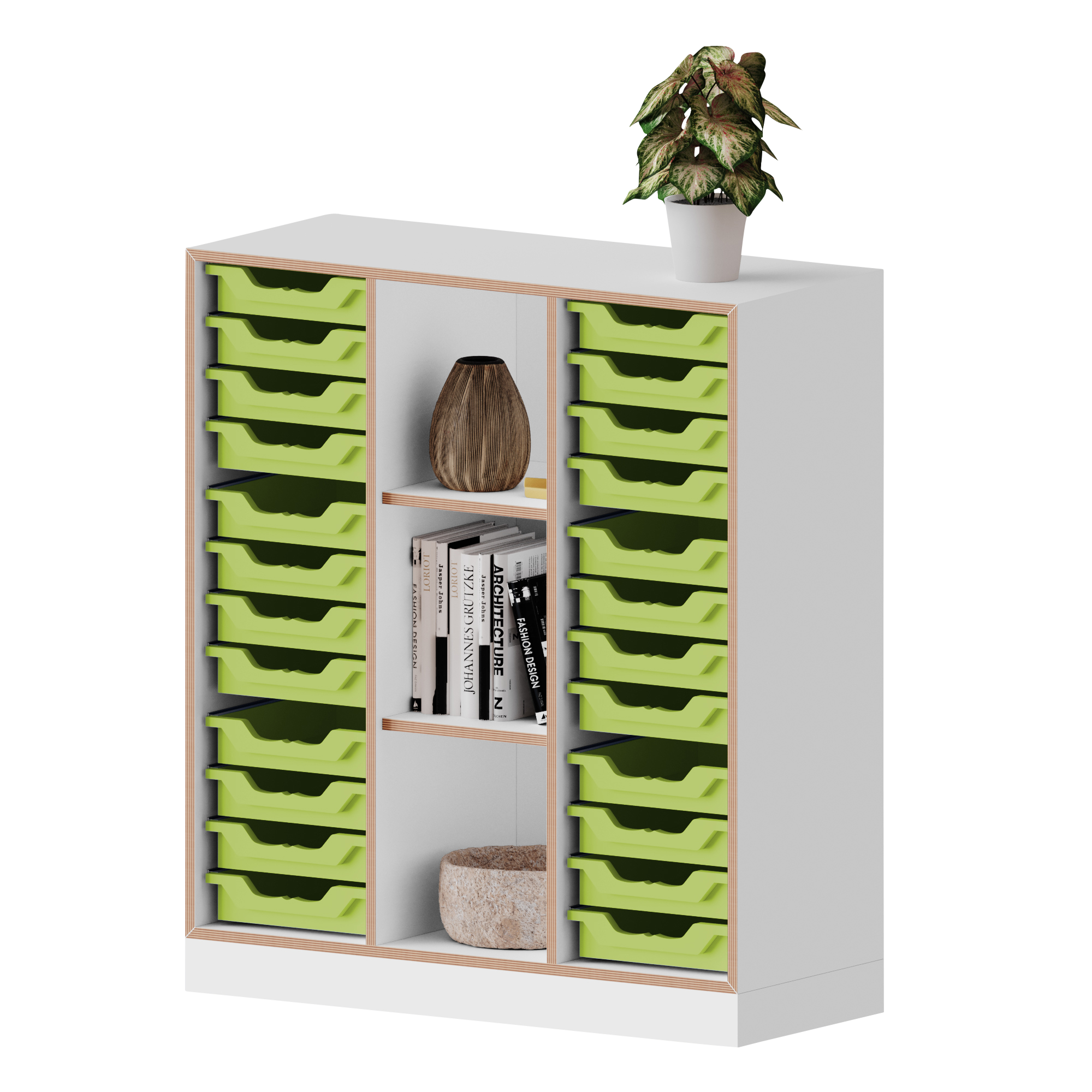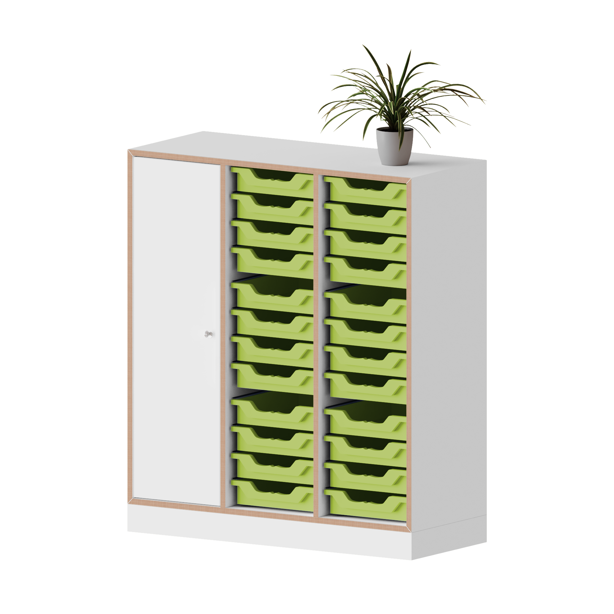 qickly® Schrank, 2 Ordnerhöhen, Linke Tür mit Schloss, 16 kleine Ergo Tray Boxen