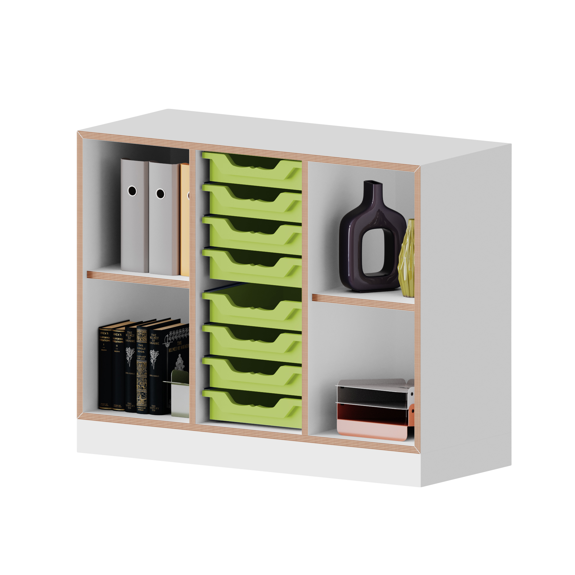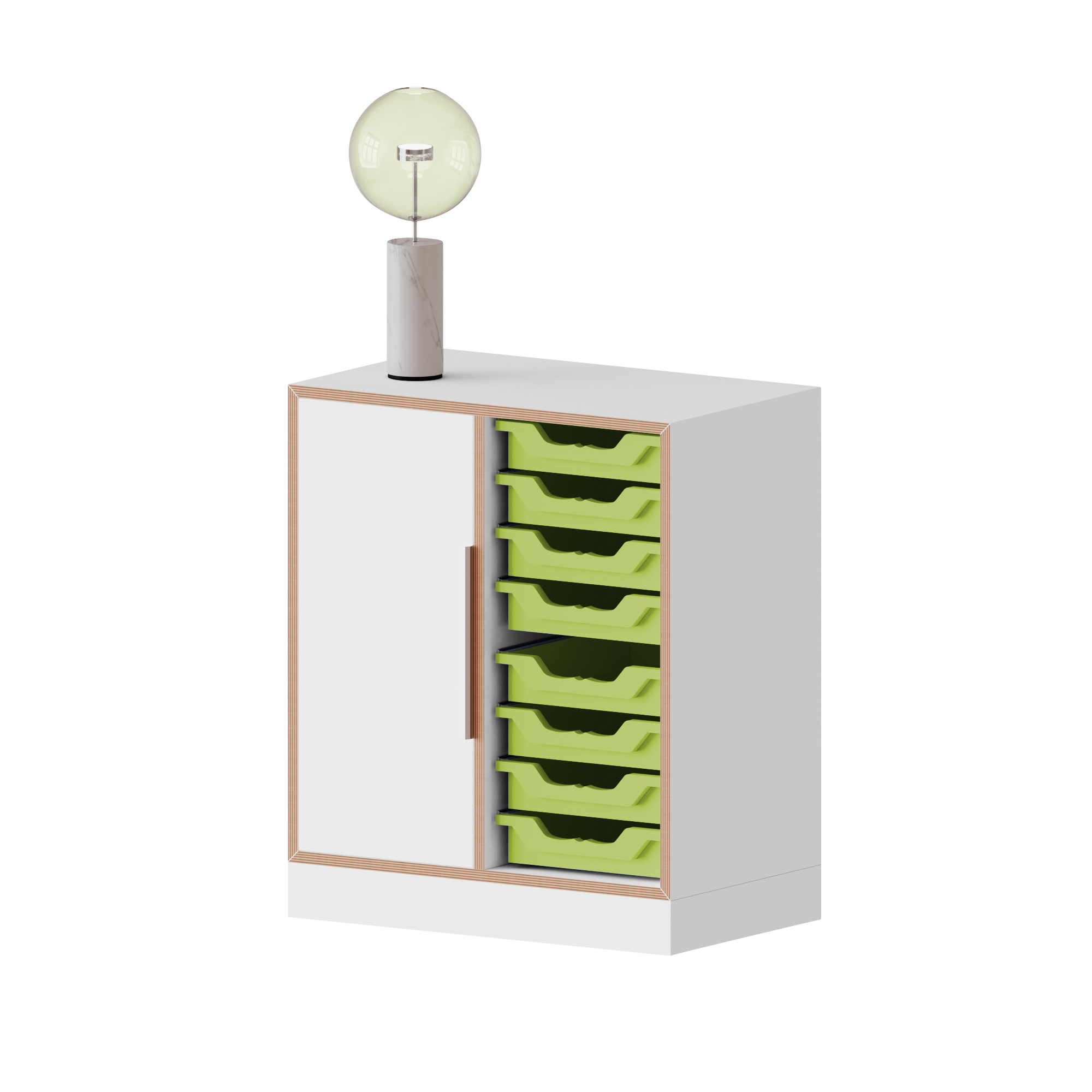 qickly® Schrank, 2 Ordnerhöhen. 1 Tür, 8 kleine Ergo Tray Boxen