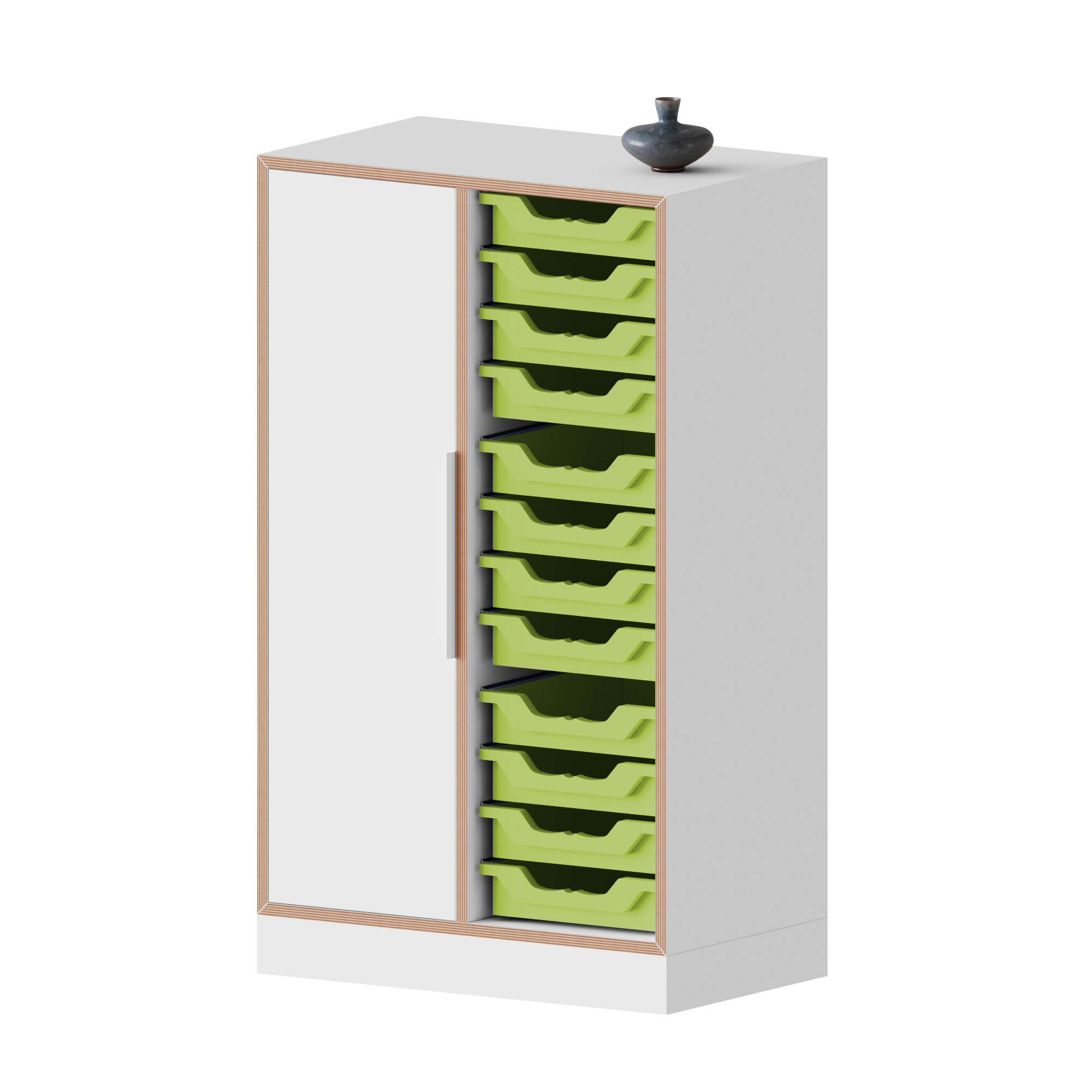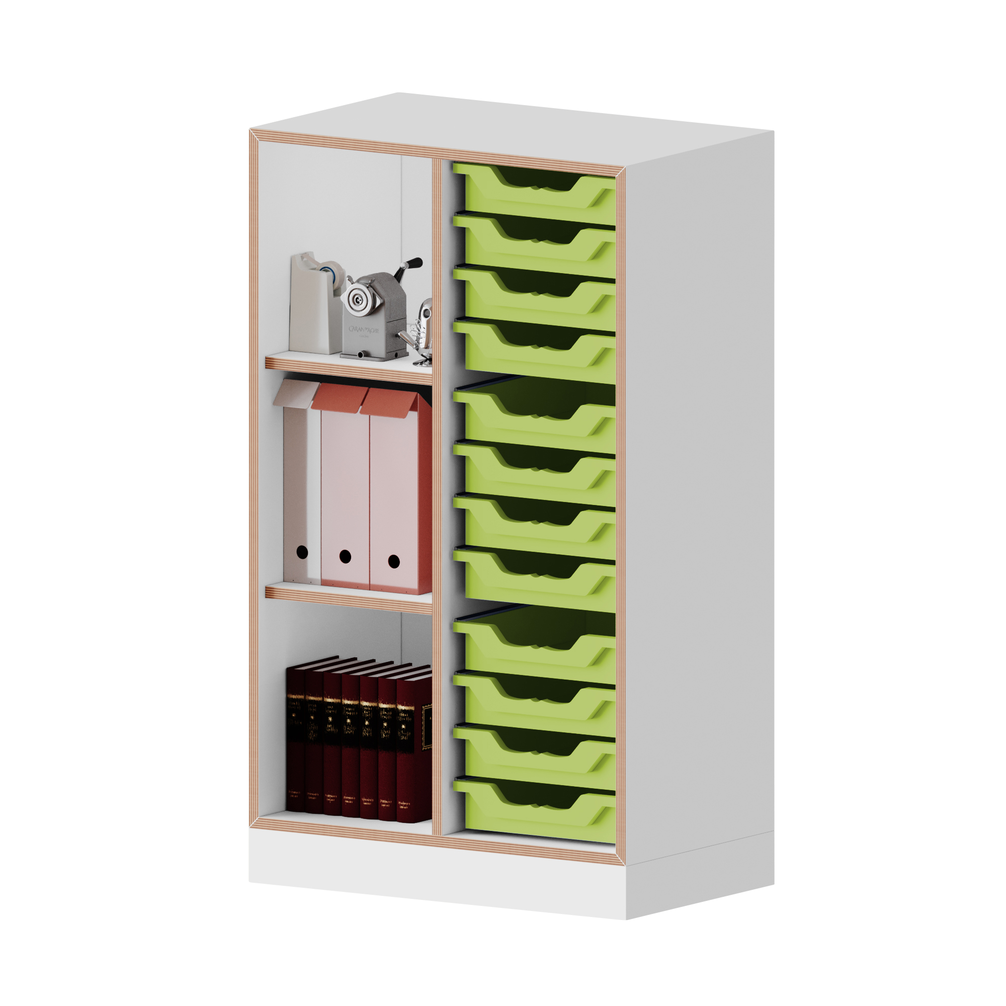 qickly® Schrank, 3 Ordnerhöhen, 1 Tür, 12 kleine Ergo Tray Boxen