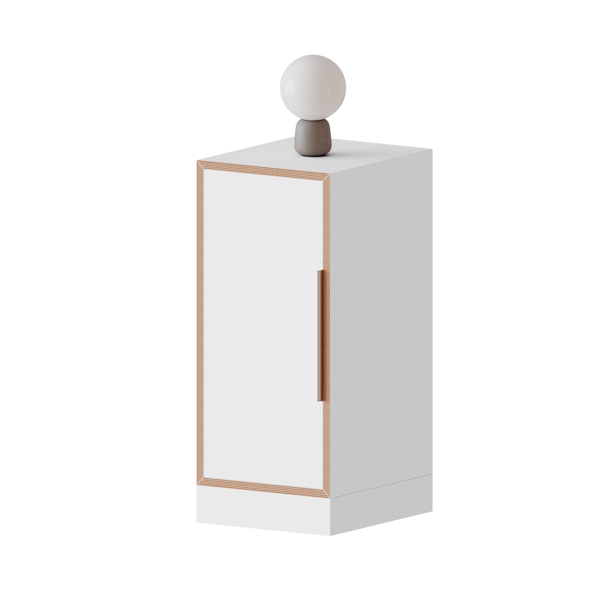 The plinth height is 8.6 cm. The plinth height does not change when optional castors are used. The material thickness of the walls and shelves is 19 mm, the fixed rear panel is 8 mm thick and guarantees a high level of stability.