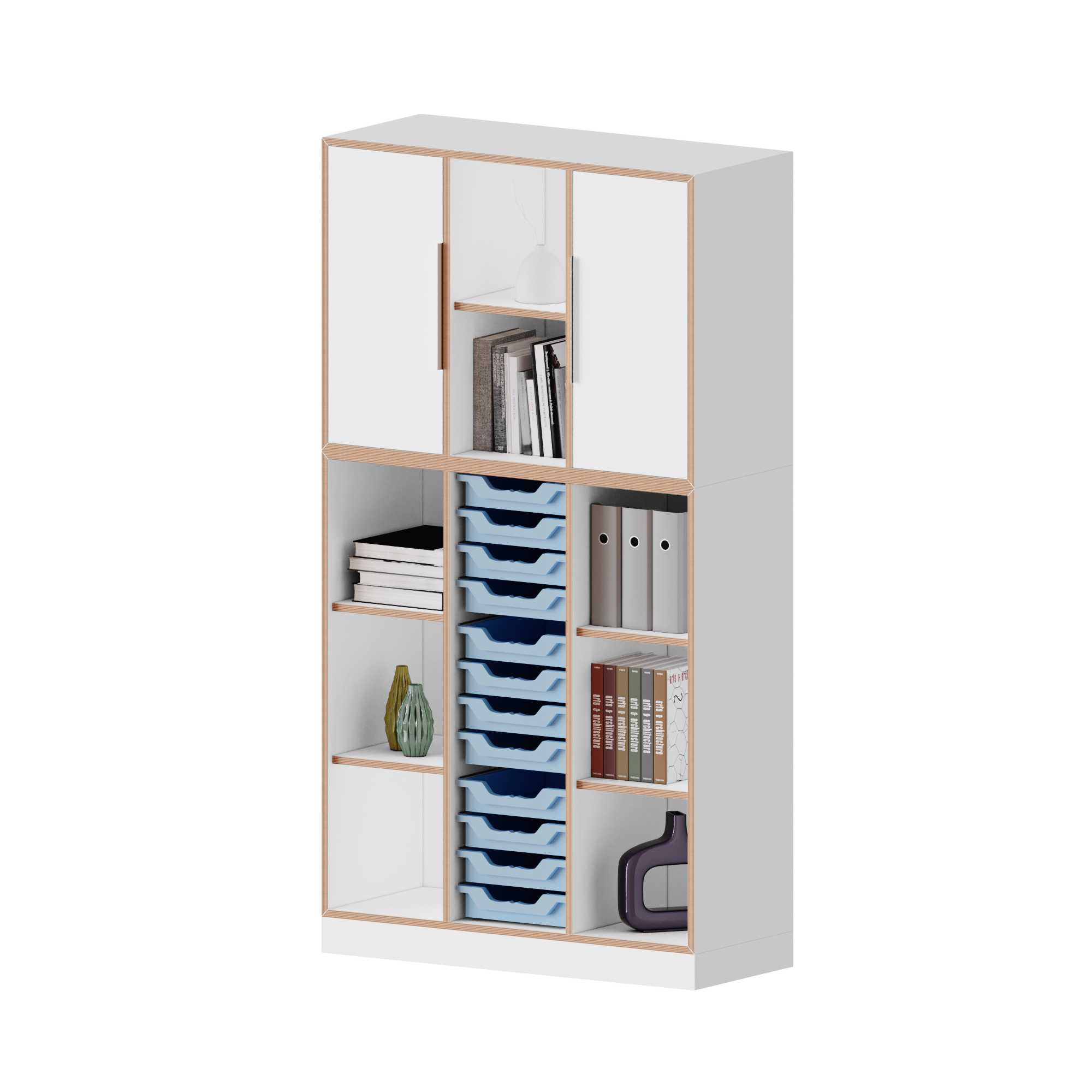 The cabinet boasts plenty of storage space and mobility, making it suitable for use in both schools and offices. It consists of a cabinet with 3 file heights and an additional top cabinet with 2 file heights. It also includes 12 small Ergo Tray boxes in which all your documents can be organized. The cabinet system can also be easily extended at any time.