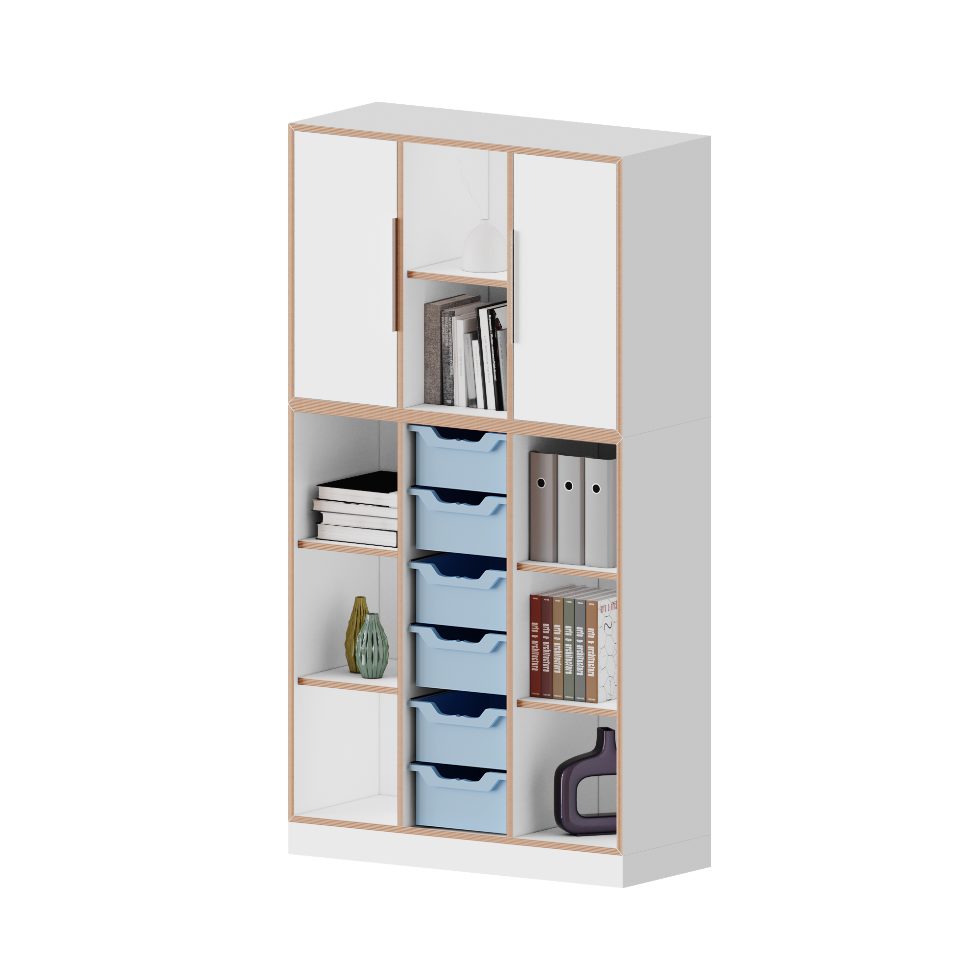 The plinth height is 8.6 cm. The base height does not change when using optionally available castors. The material thickness of the walls and shelves is 19 mm, the fixed rear panel is 8 mm thick and guarantees a high level of stability.